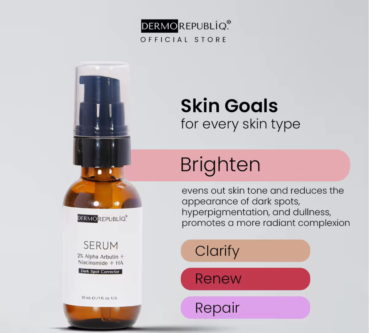 "Experience brighter, more even skin with Dermorepubliq's Dark Spot Corrector Serum. This powerful formula combines 2% Alpha Arbutin and Niacinamide to target and reduce dark spots, while Hyaluronic Acid hydrates and plumps for a radiant, youthful complexion. Say goodbye to uneven skin tone and hello to a more confident you!"