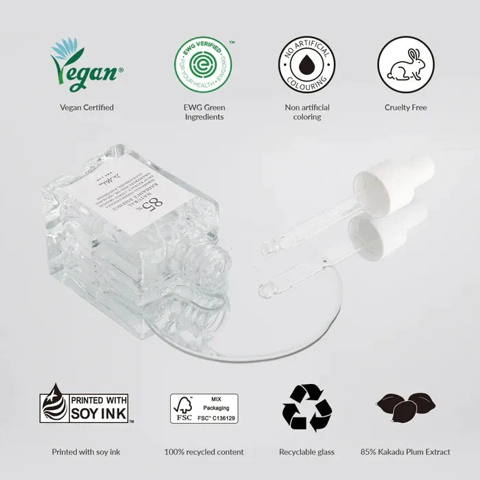 This essence is made up of 85% kakadu plum extract which is known for its antioxidant and skin brightening properties. It also contains hyaluronic acid of six different molecular weights to deeply hydrate the skin, leaving a moist and glowy finish. Vegan, cruelty-free and made with recycled packaging. Apply on cleansed and toned skin.