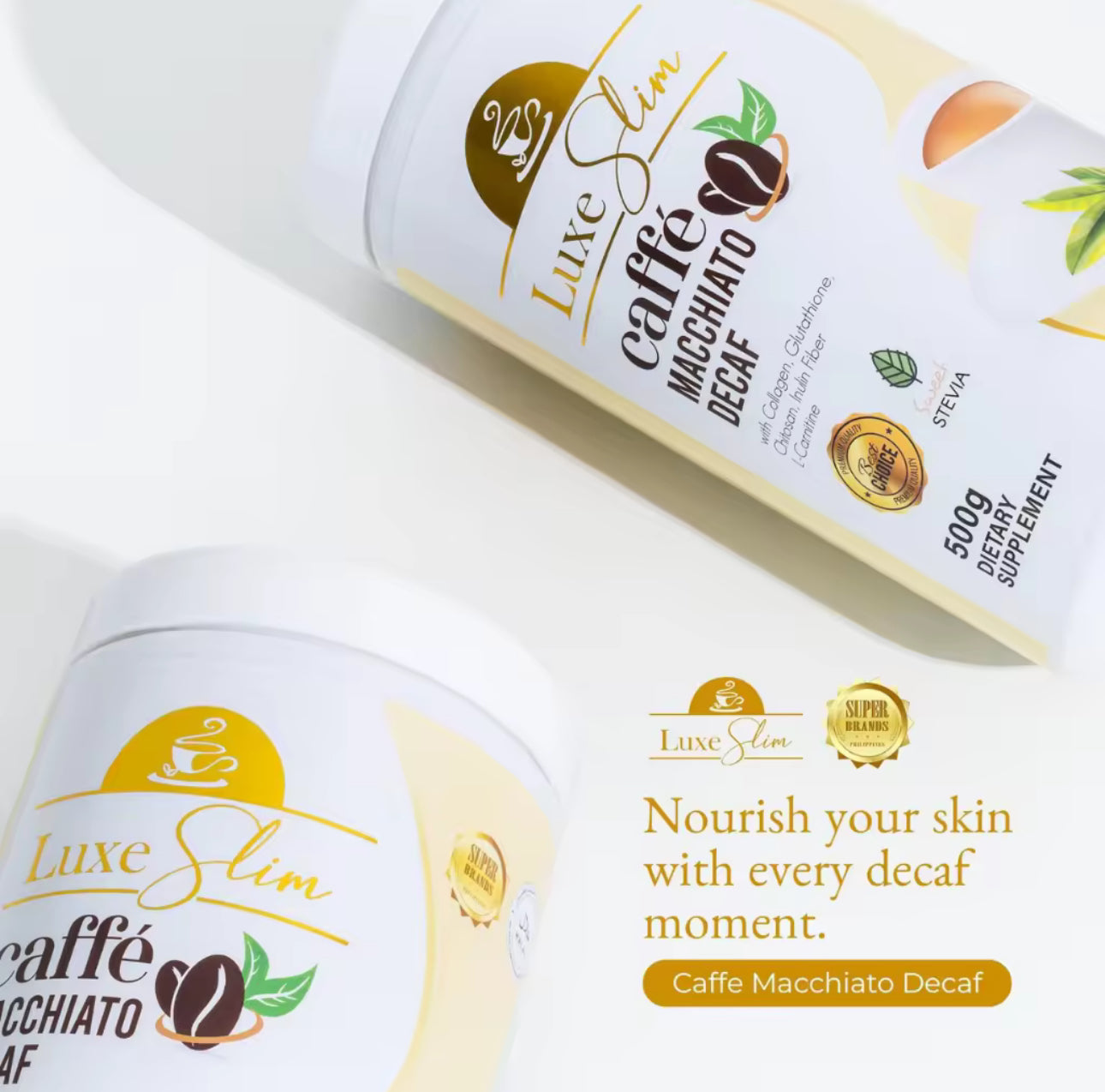 Experience the rich, bold flavor of Luxe Slim Caffe Macchiato Decaf. Made with premium, hand-picked coffee beans, this decaf blend provides all the taste without the caffeine. In a convenient 500g package, it's perfect for a luxurious and guilt-free cup of coffee anytime.